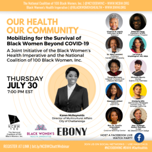 The Chattanooga Chapter of the National Coalition of 100 Black Women will host the webinar on Thursday, July 30th at 7 p.m. via zoom and our social media platforms. It will feature esteemed panelists composed of dynamic black women who are leaders in the medical field, corporate America, civic organizations throughout the United States, and elected officials. Register at bit.ly/NCBWChattWebinar.